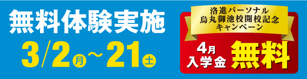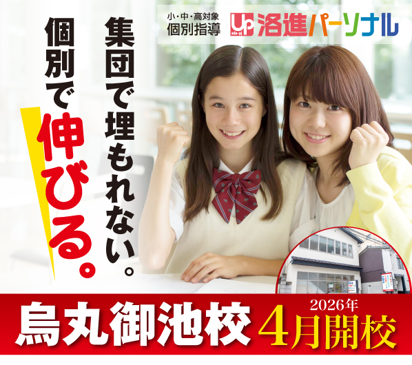 洛進パーソナル烏丸御池校 4月新規開校 更新日:2026年2月4日 対象学年 小1生〜高3生 無料体験 3月2日(月)〜3月21日(土)まで 住所 〒604-8173京都市中京区両替町通姉小路下ル柿本町389 2階 お問い合せ お申し込み お気軽にお問い合わせください 【教務室】フリーダイヤル0120-22-8190 受付時間/10:00〜17:00 【洛進パーソナル烏丸御池校】Tel.075-223-6010 ※進学館烏丸御池校につながります。 受付時間/14:00〜19:00 無料体験はこちら 詳細PDFはこちら