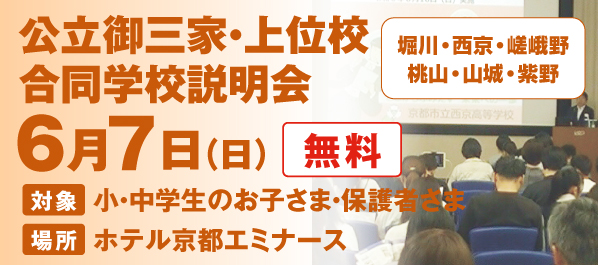 | 日程 | ◆6月7日(日)10:00〜13:40 第1部 10:00~11:50 御三家(堀川高校・西京高校・嵯峨野高校) 第2部 12:10~14:00 上位校(桃山高校・山城高校・紫野高校) |