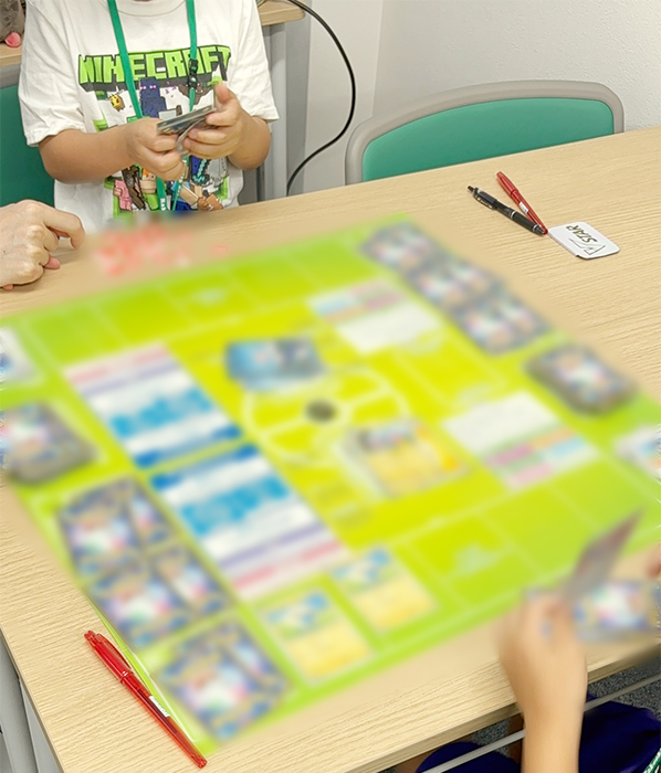 同時開催の「ポケモンカード特別授業」では、「ゲームカレッジLv.99」のポケモンカードベテラン講師の方(全国大会出場経験もあるのだとか!)にお越しいただき、保護者の方にもご見学いただきながら、「ゲーム学習」の実践授業を実施しました。子どもたちはたくさん準備されたポケモンカードに夢中になりながらも、先生の話はしっかりと聞き、ワークシートに取り組む様子も見られました。ゲームを使った新しい学習の可能性を感じたトライアル授業でした。