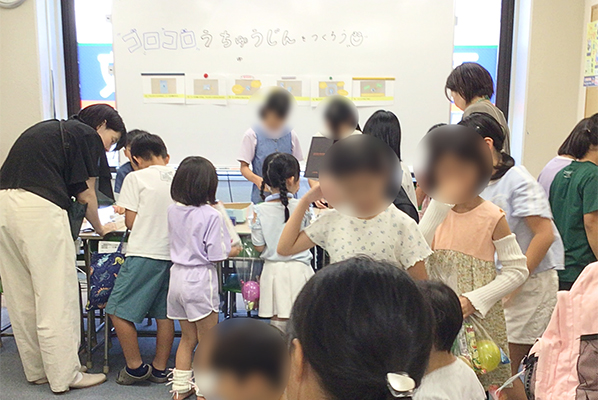 同時刻、子どもたちは「夏祭り」に参加。コロコロ宇宙人を作る工作をしたり、ヨーヨー釣り、わなげ、射的などをしたりして、夏祭りを楽しみましたね。